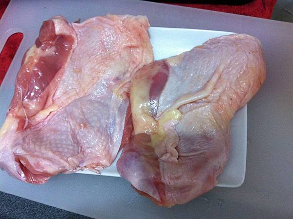 好市多的去骨雞腿我分2包145元(一包2隻腿)..完全退冰~肉比較厚一點的地方用叉子搓2下~