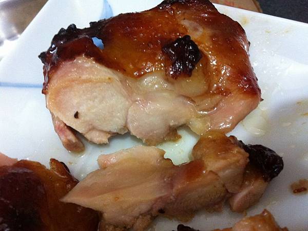 撇開皮不看的話...蜜汁好香雞腿好嫩(但應該可以在多醃一下味道會更足....剩一片打算晚上烤)..