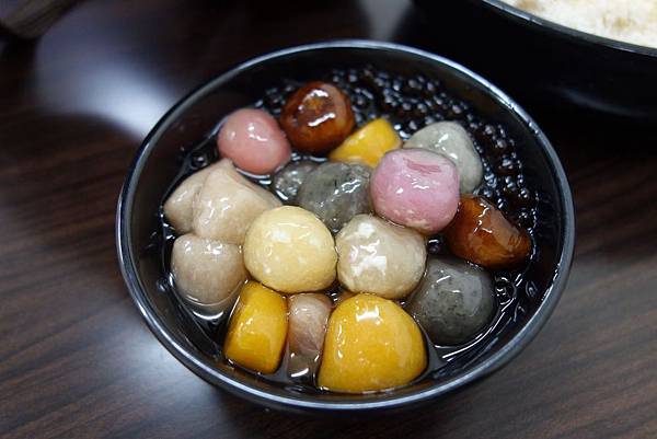 除了最愛的芋圓外..不同顏色的粉圓包著不同餡料-黑灰色是芝麻..咖啡色是龍眼..和豆沙ㄨㄟㄇㄟ